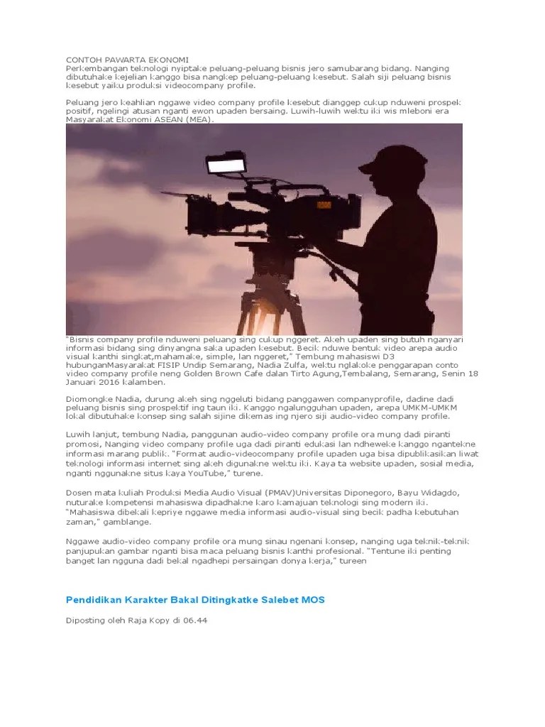 Contoh pawarta jawa tentang ekonomi. Jul 24, 2021 · contoh verba pewarta. Untuk mempermudah penjelasan mengenai kata kerja pewarta yang digunakan dalam teks berita, kami menyertakan contohnya dengan kata dan kalimatnya, berikut ini: Dalam pawarta ini, siswa diharapkan bisa membuat dan membaca teks pawarta dengan baik dan benar. Contoh pawarta basa jawa singkat pawarta bab prastawa kang nganggo korban asing kapacak ing layang kabar, majalah, utawa tv. Jun 03, 2019 · contoh pawarta bahasa jawa, tumpeng dadi salah siji aspek budaya contoh pawarta bahasa jawa ini memberitakan dunia kemiliteran di indonesia. Saka bitcoin tekan gas elpiji 3 kg. Berikut di bawah ini adalah contoh teks pawarta bahasa jawa yang berisi mengenai bitcoin sampai gas lpg 3kg. More images for contoh teks pawarta » Jul 06, 2021 · di sini saya akan mencoba memaparkan contoh teks berita bahasa jawa atau teks pawarta bahasajawa dengan tema kemalingan. Tentara wajib mahami aspek budaya masyarakat neng panggon dekne kabeh nug… Pedoman sesorah pidato bahasa jawa pambagyaharja ketua dalam acara rapat pemuda. Jul 25, 2019 · contoh pawarta bahawa jawa "proyek rel" proyek rel ganda nemahi perkawis gantos rugi tanah tim pembebasan tanah proyek rel ganda kabupaten kendal, jawa tengah, nemahi perkawis.