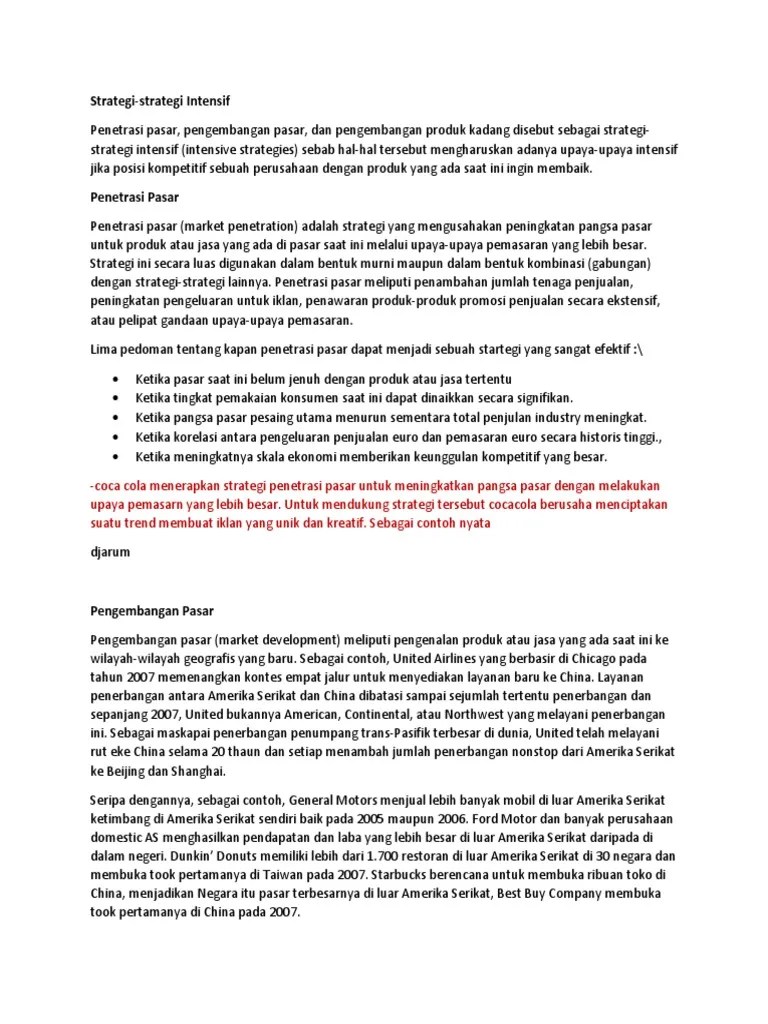 Para umkm seringkali bingung menetapkan strategi usahanya. Perbedaan utama antara penetrasi pasar dan perkembangan pasar adalah bahwa penetrasi pasar adalah strategi di mana perusahaan menjual produk yang ada di . Strategi penetrasi pasar pakaian olahraga muslim pada pt. Banyak sekali kalimat tentang penetrasi pasar dan pengembangan pasar,. Zhulaydar esa putri, nida khoirun nahda labibah, zulfa fauziah . Strategi market intensive dilakukan melalui penetrasi pasar dan pengembangan pasar; Penelitian ini membahas tentang strategi penetrasi pasar dan strategi pengembangan pasar yang diterapkan oleh divisi diagnostik pt abbott indonesia. Produk terhadap strategi penetrasi pasar untuk. Pengembangan pasar dapat semakin mudah memahami strategi marketing. "tinjauan strategi penetrasi pasar terhadap penjualan pesawat nc212 pt dirgantara indonesia (persero) di afrika". Produk terhadap penetrasi pasar pada kinerja pemasaran. Berikut adalah strategi penetrasi pasar yang bisa memajukan umkm.